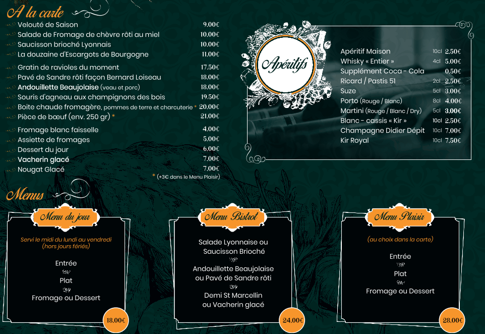 On y retrouve la salade Lyonnaise, le st Marcellin rôti pour les entrées. Pour le plat de résistance, par exemple, cela sera filets de perche Vermouth ou souris d'agneau confite et autres....